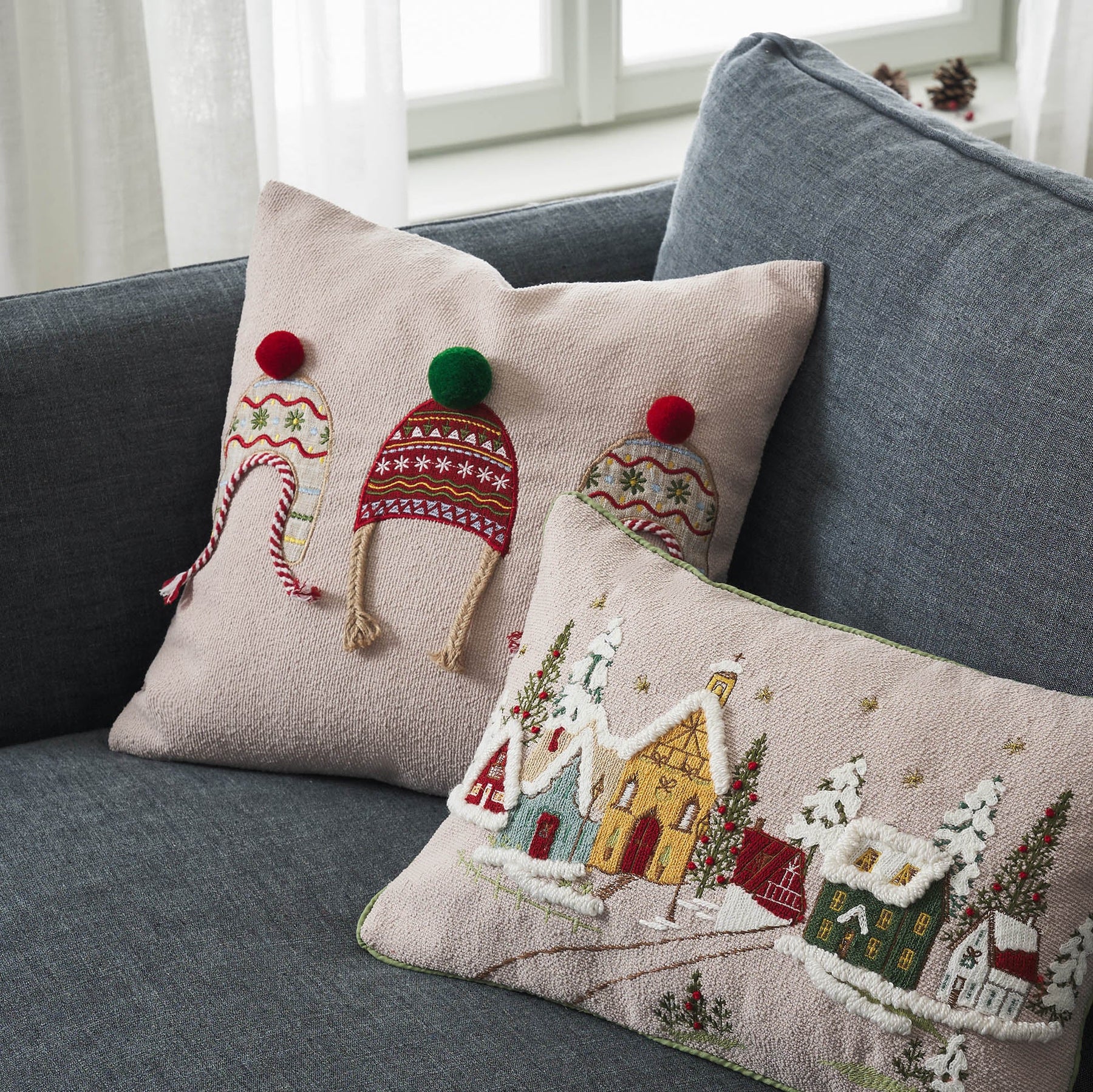 Μαξιλαροθήκη με κεντημένο σχέδιο και ανάγλυφες λεπτομέρειες από γιούτα και pom pom.